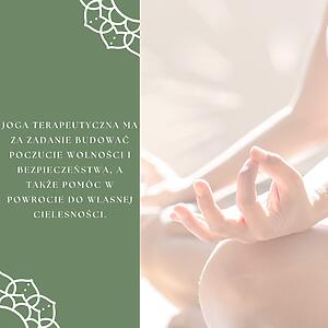 Joga terapeutyczna ma za zadanie budować poczucie wolności i bezpieczeństwa, które nam zabierają wydarzenia traumatyczne. Zachęca do doświadczania cielesności, odkrywania możliwości ciała bez konieczności osiągania “idealnej” symetrii, zaufania własnemu doświadczeniu. Zachęca do zbadania uczucia dyskomfortu, by dotrzeć do intuicji, która pozwoli uwolnić napięcie. Uczy mądrego wykorzystywania energii, umiaru i szczerości. W końcu pozwala na powrót do swojej prawdziwej natury.